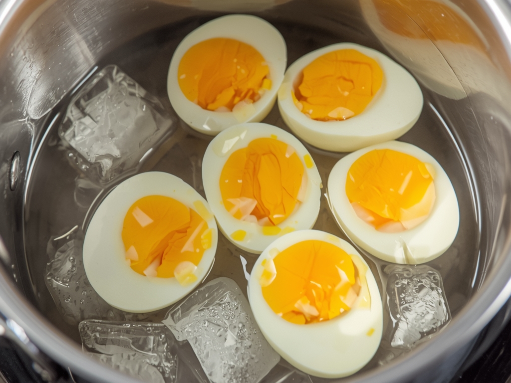 After 12 minutes in the ice bath, the eggs should be fully cooked with firm whites and set yolks. If you’re unsure, peel one egg and check the consistency.