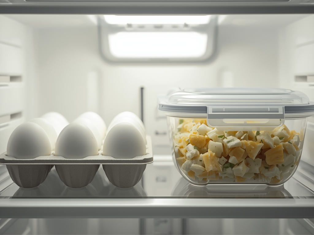 Store boiled eggs in their shells in the refrigerator for up to one week. Once peeled or made into egg salad, store in an airtight container for up to 3 days. Egg salad is best enjoyed cold, so there’s no need for reheating. If the salad seems dry after refrigeration, stir in a small amount of mayonnaise to refresh it.
