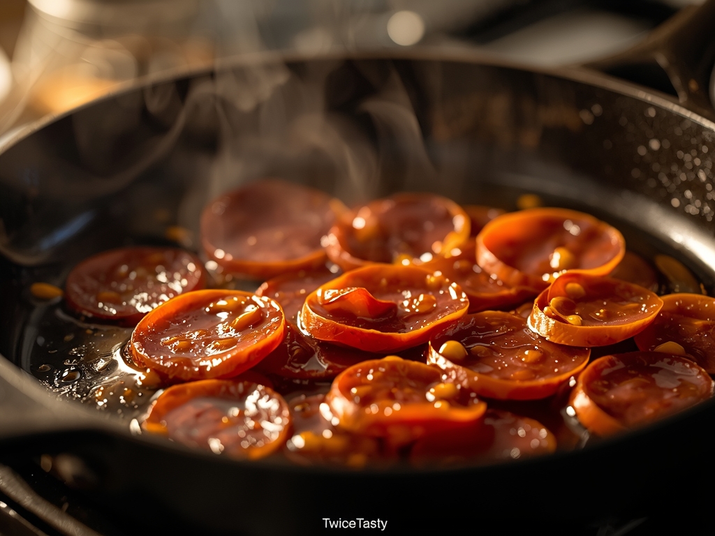 Scrape those pepperoni slices and sausage crumbles into the pan first. Listen to the sound. It shouldn’t just sizzle; it should hiss and pop. We are rendering the fat. We want the edges of the pepperoni to cup and curl, turning from a soft, cold slice into a crispy, salty chip. As the fat melts out of the meat, tilt the pan. You can actually spoon some of that excess grease out (save it for roasted potatoes later). You just want enough in the pan to coat the bottom, not swim in it.