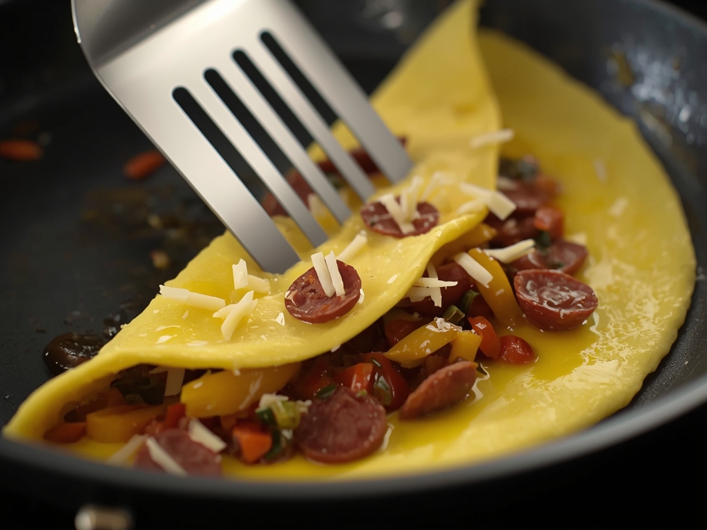 Fold the empty half over the filling. Slide it out onto a warmed plate. What you have now is a study in contrasts. The outside of the omelet is soft and tender. The interior is molten and cheesy. But the filling? The filling is al dente. You get the crunch of the re-crisped pepperoni, the chew of the sautéed peppers, and the savory depth of the mushrooms, all distinct and separate, not lost in a mush of egg.