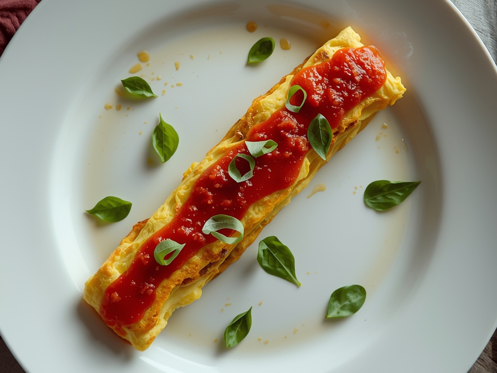 Instead, spoon a wide, swooping stroke of the red sauce across the plate in front of the omelet, like a painter’s canvas. Slide the omelet so it sits half in the sauce. You dip the omelet as you eat it. It keeps the eggs pristine and bright, while offering that acidic, tomatoey punch that defines pizza flavor.