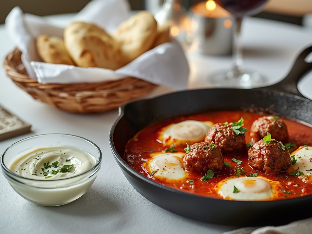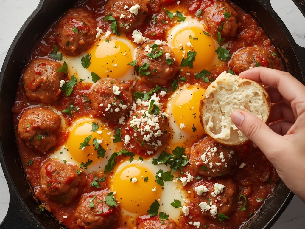 Shakshuka is inherently soft: poached eggs, stewed peppers, and simmered tomatoes. Adding meatballs introduces a necessary chew and texture variance. It turns the dish from a “dip” into a substantial meal.
