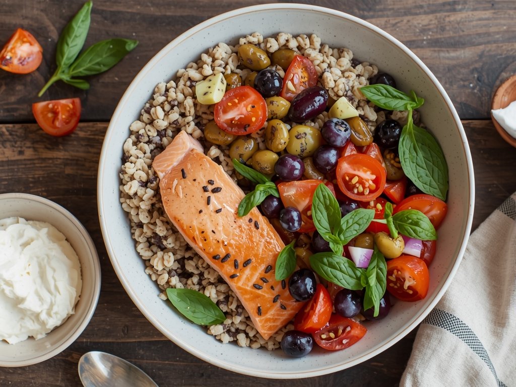 Now we need to wake up the palate. Salmon is fatty and rich. Even when it’s cold, it’s heavy. To make this bowl sing, you need acid and crunch. This is where the Mediterranean profile shines.
